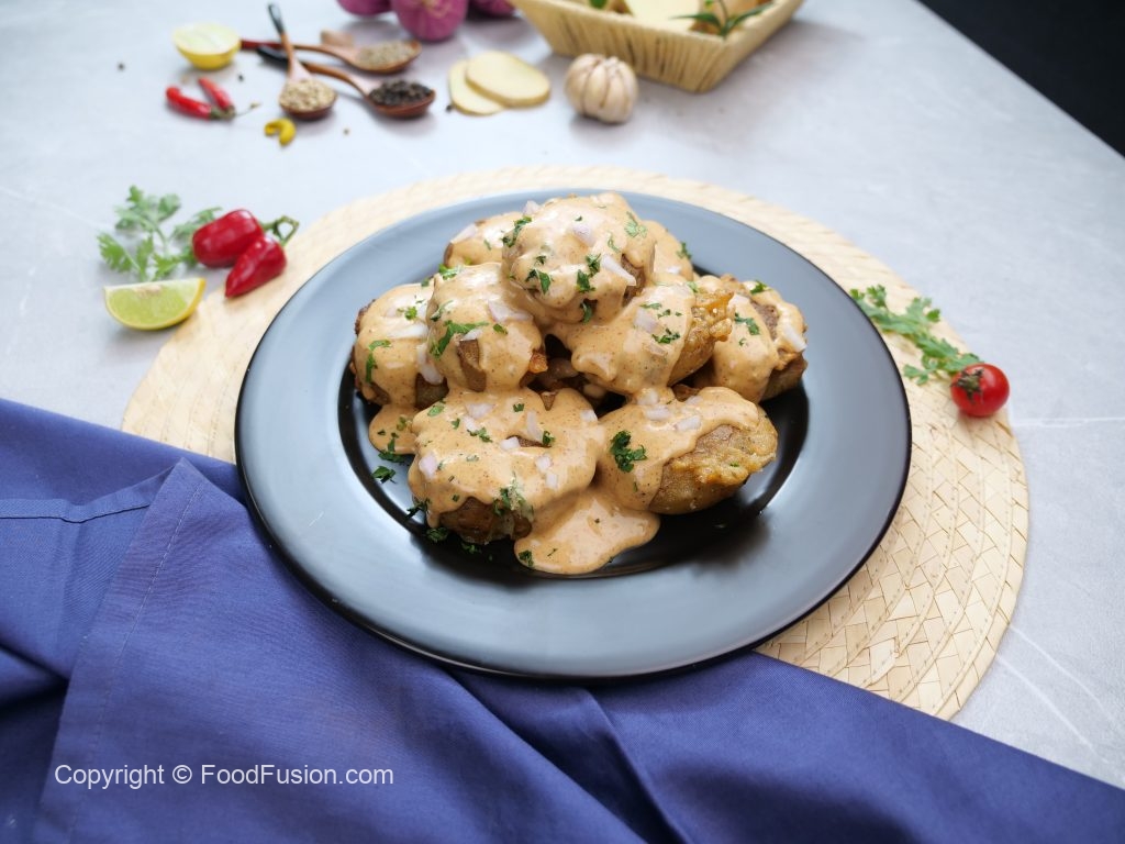 -In a frying pan,heat cooking oil,dip smashed potatoes in prepared batter & shallow fry from both sides until golden brown.