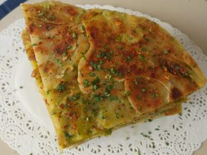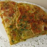 On one side of dough,add prepared filling 2-3 tbs and spread evenly,fold one side and press to seal the edges,prick with fork,drizzle cooking oil,sprinkle dry flour,fold to make a cone shape,press gently and roll out with the help of rolling pin (makes 5-6).