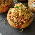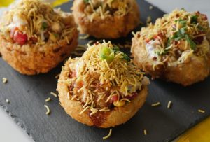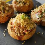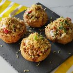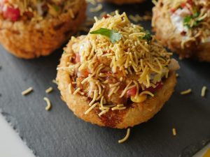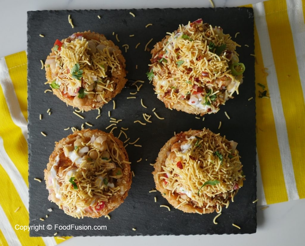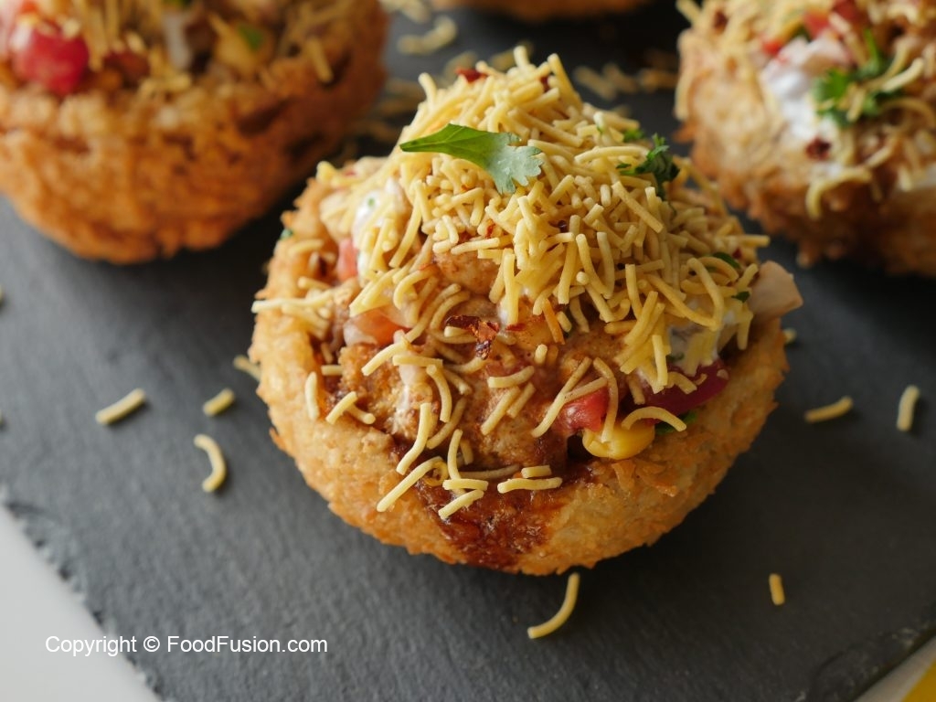 On onion cup,add aloo tikki pieces,chickpeas mixture,yogurt,khatti meethi chutney,nimco sev,red chilli crushed,fresh coriander & serve!