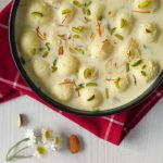 -In boiling milk,add prepared balls & cook on very low flame until they float on the surface & increase in size (don’t stir),cover & cook on low flame for 10 minutes.