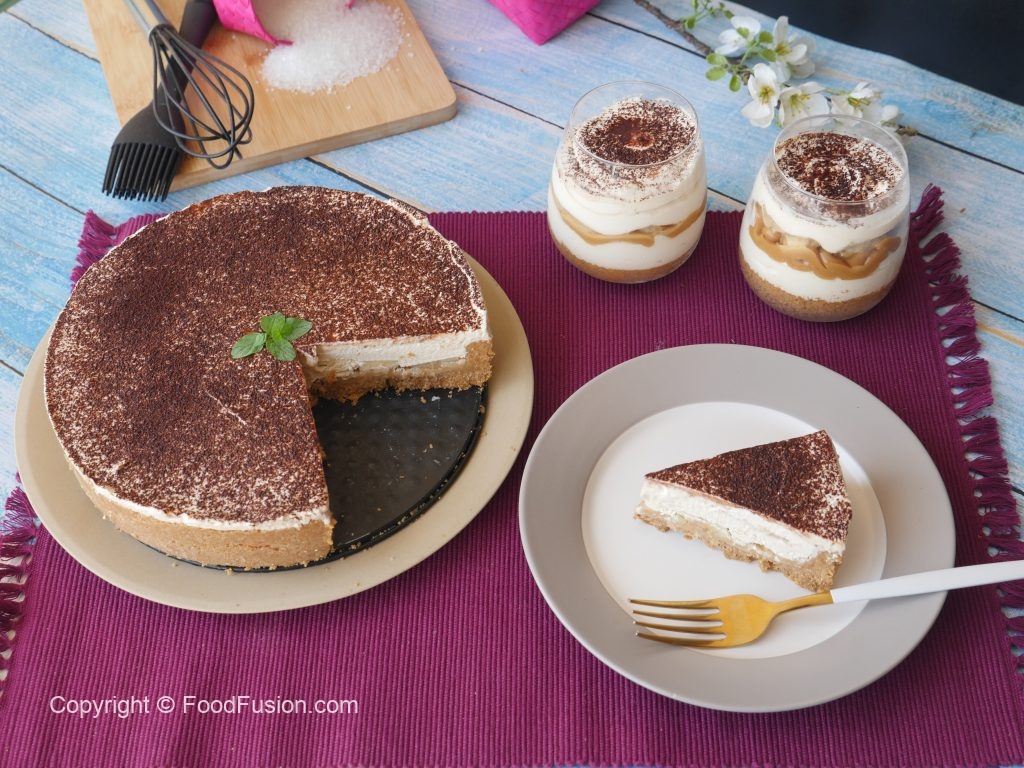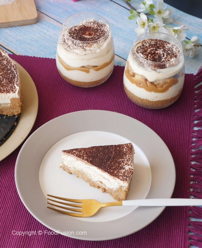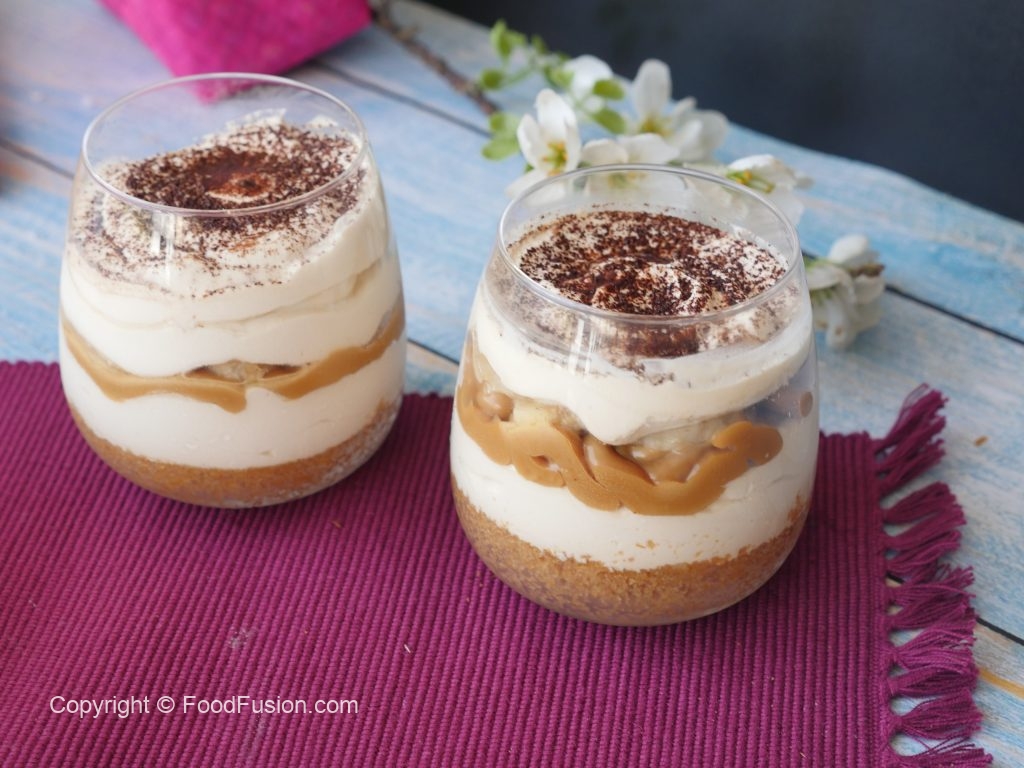 Ab cream mixture, dulce de leche, banana slices, cream mixture ki layer daal kar upar se cocoa powder charak den.
