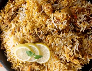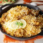 Add mint leaves,fresh coriander,fried onion,dried plums,boiled rice & sprinkle orange food color on top, cover & steam cook on low flame for 15-20 minutes.