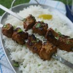 -Marinated meat ko skewers per laga lein.