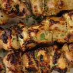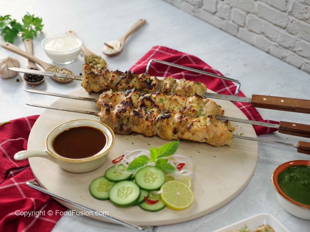 -Chicken pieces ko metal skewers mein lagayein (5 skewers bana lein).