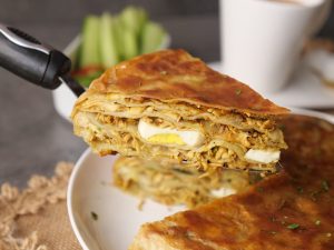 Is he tarhan baqi roll/samosa patti ki layers laga lein aur edges ko fold ker ka set ker lein (repeat 4 layers).