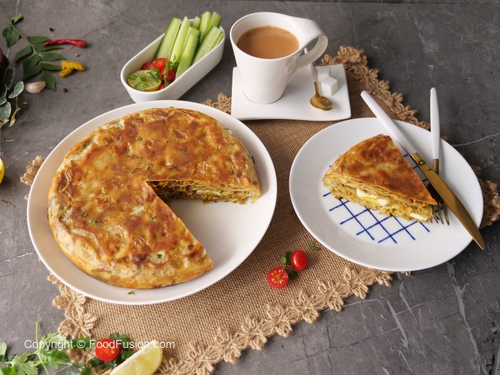 Two roll/samosa patti (6.5 x 9 inch) ko pheetay hoye anday mein dip karein aur tray per rakh dein (+ shape).