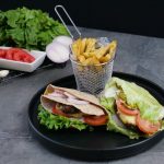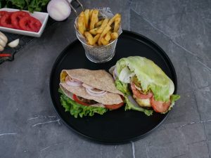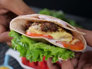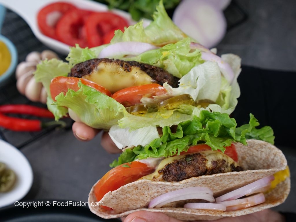 Two iceberg leaves lein aur ek quarter side per mustard paste & pickled jalapeno,dosray per mayonnaise & tamatar slices,tesaray per tomato ketchup & cheeseburger patty aur forth per pyaz rings rakh dein,tamam sides ko fold ker ka wrap tayyar ker lein & serve karein!