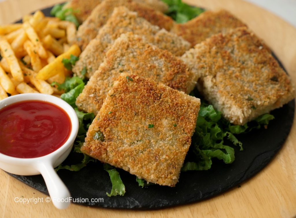 Cut into four pieces and coat potato side of bread slice with breadcrumbs (makes 8 bread slices).