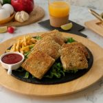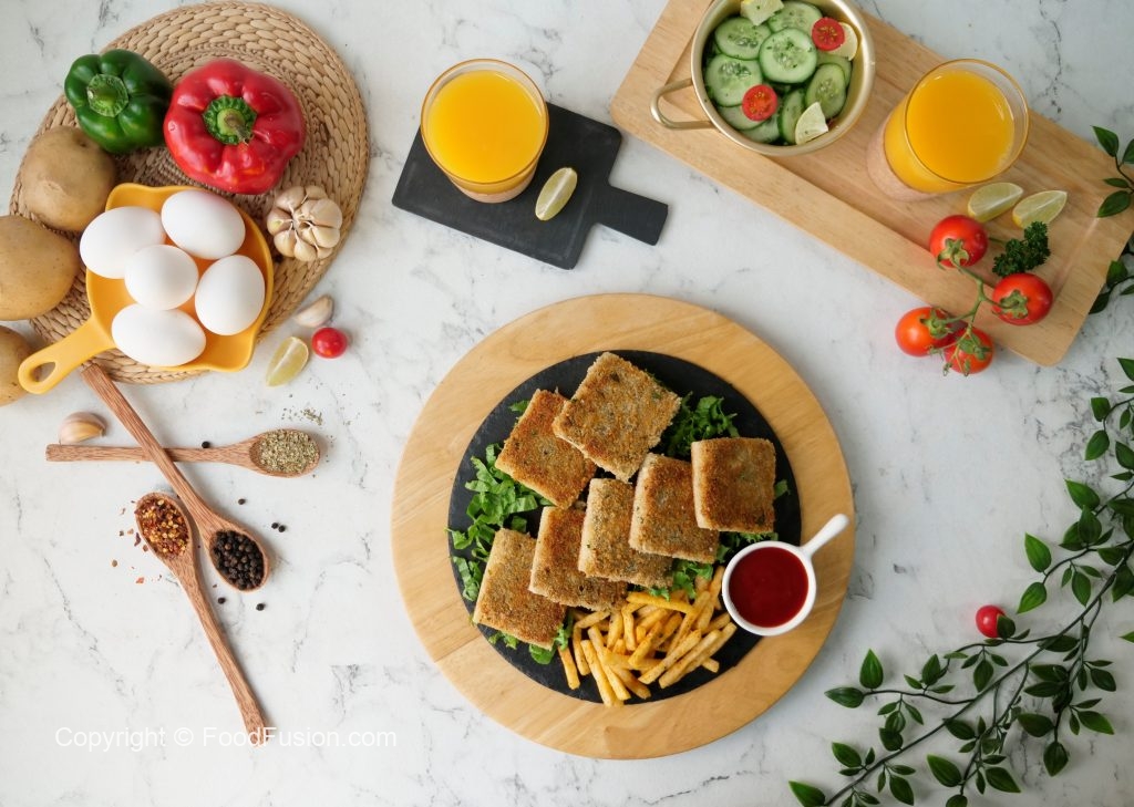Four piece mein cut ker lein aur bread slice ki potato side ko breadcrumbs sa coat ker lein (makes 8 bread slices).