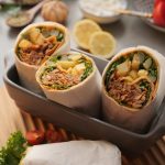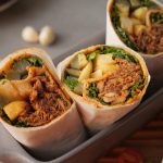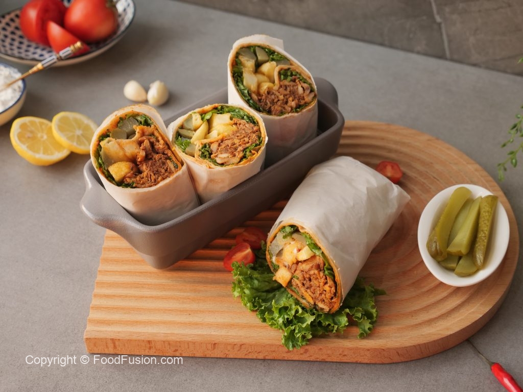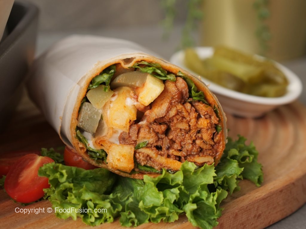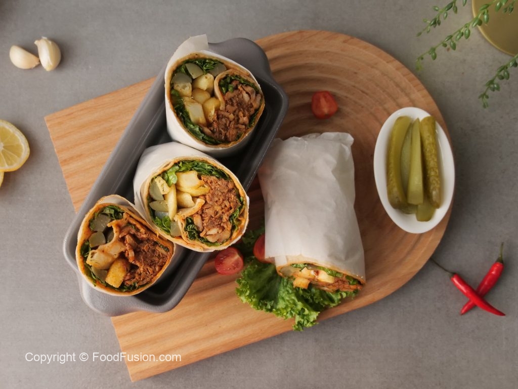 -Butter paper per lavash flatbread rakh dein aur tayyar sauce dal ker pheela lein,salad patta,cooked chicken,potato fries,pickled cucumber,tomato ketchup,mayonnaise dal ker sides ko fold ker lein aur roll ker ka butter paper mein warp ker lein (makes 6) & serve karein.