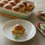 Baking dish mein burger buns rakh ker tomato ketchup,cheddar cheese,cooked chicken mixture,pickled cucumber,pyaz slices aur mozzarella cheese slices dal ker upper sa top buns rakh dein.