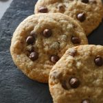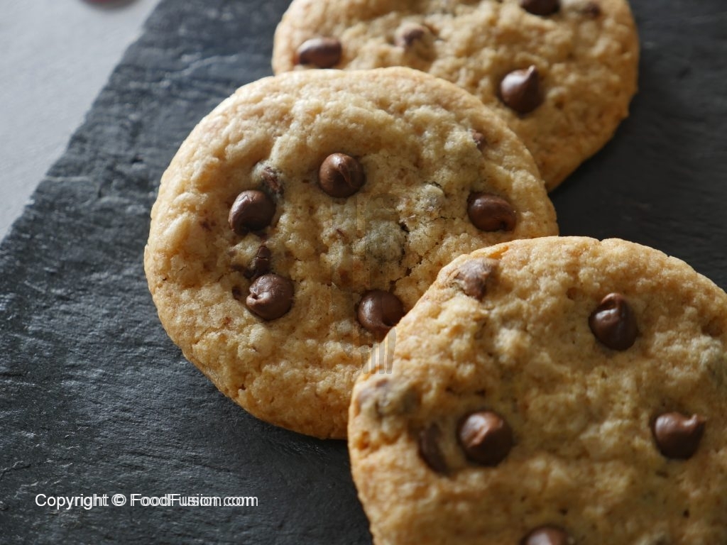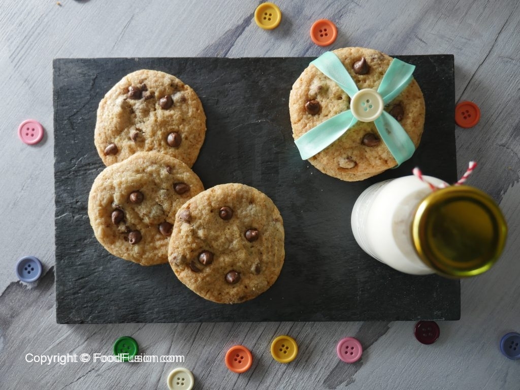 Grease baking tray with oil,take a mixture and make a ball,place it over the baking tray and slightly press it and add chocolate chips.