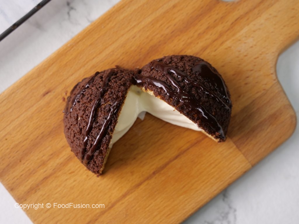 -Custard cream-filled bag ki tip ko her choux mein insert ker ka bhar dein.