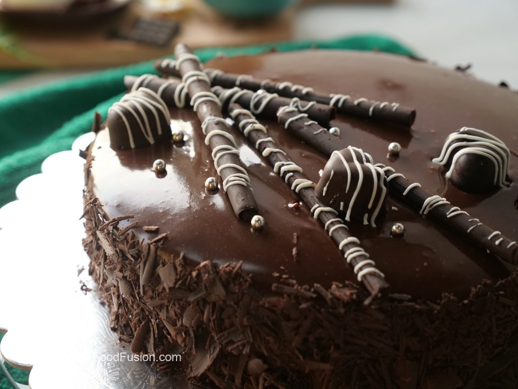 -Reserved warm chocolate ganache ko cake ka upper dal dein,cake ki sides per grated chocolate laga lein aur 30 minutes kliya refrigerate ker lein.
