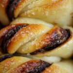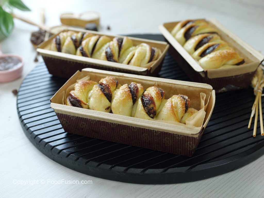 -Spread chocolate spread on rolled dough & flip one end over the other.