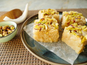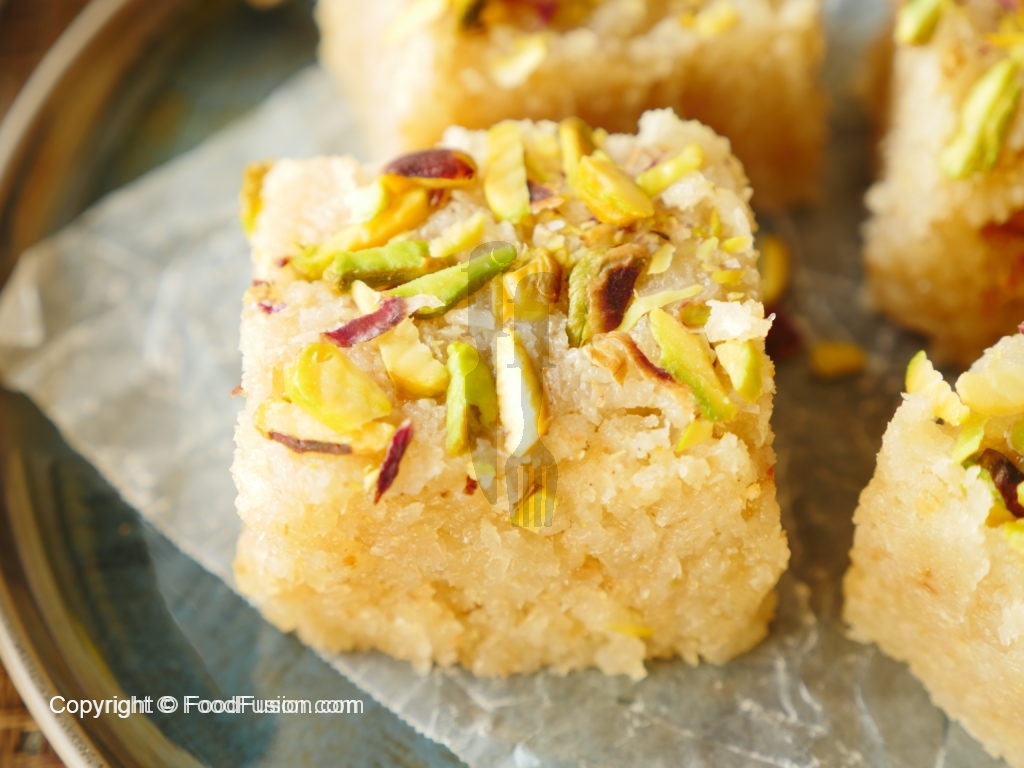 Soaked desiccated khopra use kertay hoye yehe recipe follow karein aur cooking ka waqt doodh ko skip ker dein.