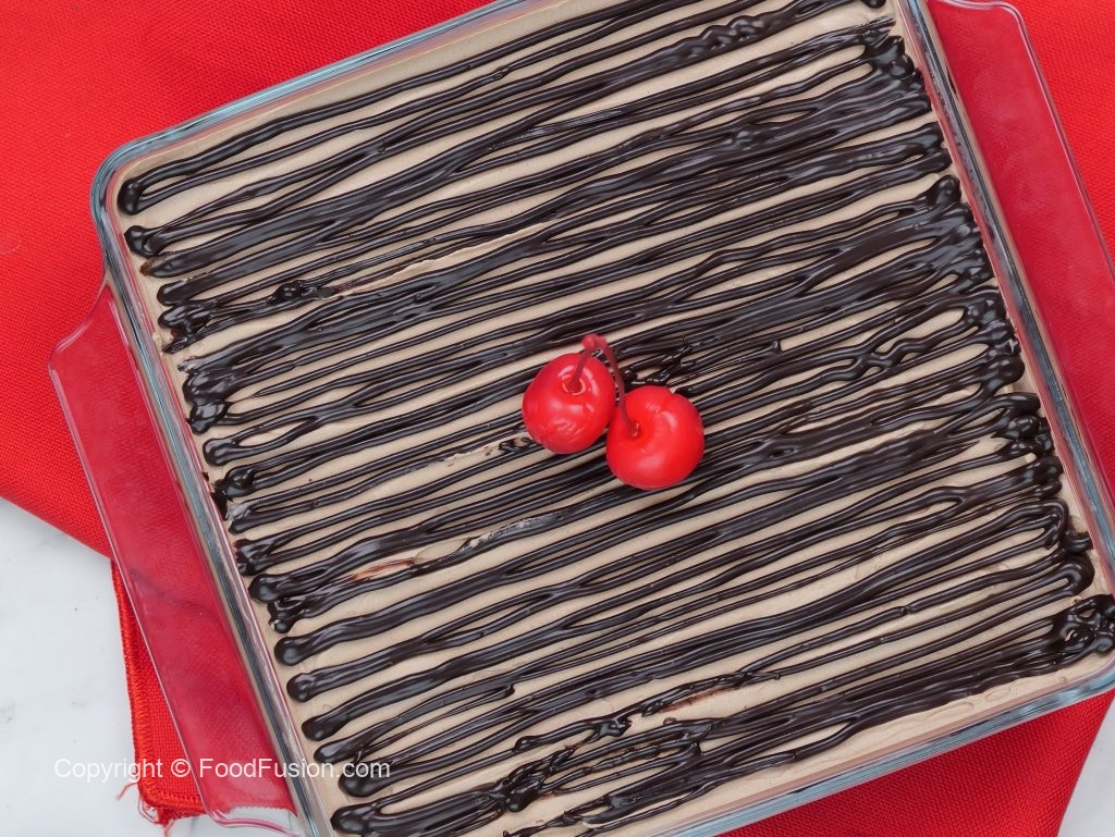 -Chocolate chip biscuits dipped in milk & coffee mixture ki ek aur layer laga ker tayyar coffee & cream mixture dal ker evenly pheela lein.