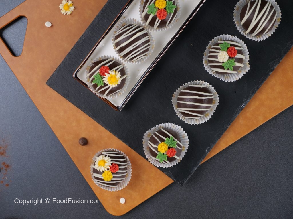 -White chocolate drizzle karein,chocolate flowers sa decorate ker lein aur set ho janay tak refrigerate ker lein (makes 12 truffles).