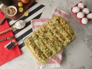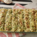 Place stuffed crepe rolls in a baking dish,add cheddar cheese,mozzarella cheese,red chilli crushed & dried parsley.
