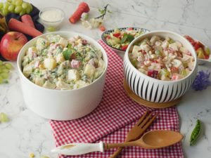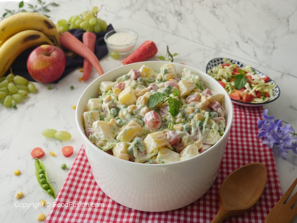 In a bowl,add cream,mayonnaise,caster sugar,black pepper crushed,salt & whisk well to combine.