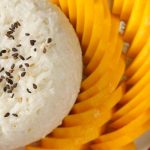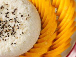-In a serving plate,place sticky rice,mango slices,black sesame seeds,pour creamy coconut sauce & serve!
