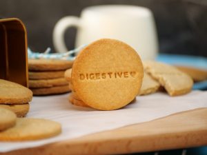 -Cookie cutter (2.25 inches) ki madad sa round shape mein cut ker lein (2 mm thick biscuits).