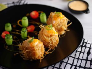 -Garnish with bang bang sauce,caviar,green onion,cucumber & cherry tomato.
