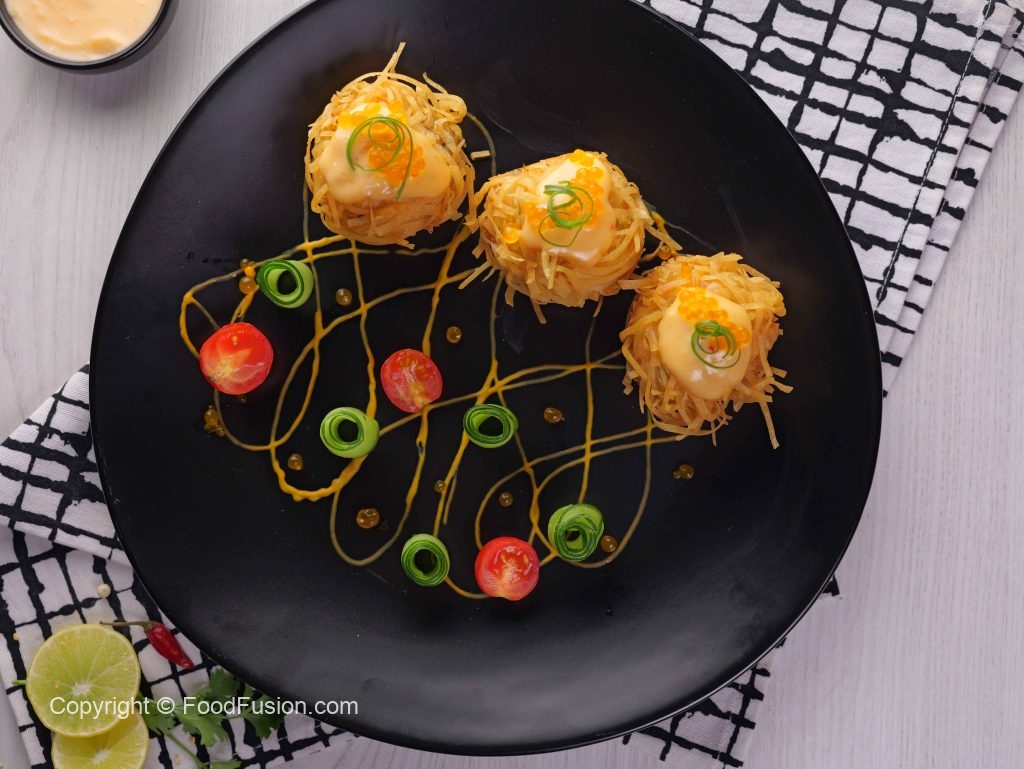 -Garnish karen bang bang sauce, caviar, green onion, cucumber aur cherry tomato ke saath.