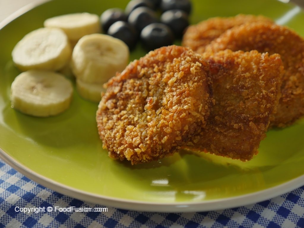 Ab bread slices ko pheetay hoye anday mein dip karein phir corn flakes mein coat ker lein.