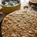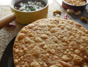 Take a small dough (70 g),sprinkle dry flour and roll out with the help of rolling pin & prick with fork (makes 5-6).