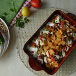 In serving dish,add yogurt,phulkiyan,red chilli crushed,chaat masala,potato,chickpeas,tomato,onion, meethi chutney,green chutney,papri,yogurt,meethi chutney,green chutney,red chilli crushed,tomato, papri & serve!