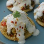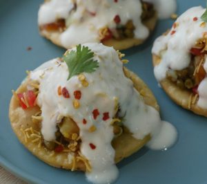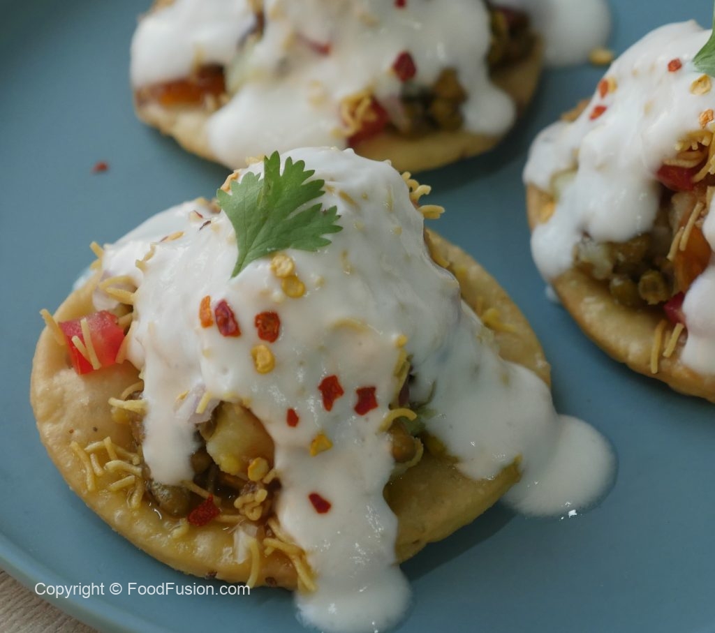 On puri,add potato+green lentil,onion,tomato,chaat masala,lemon juice,green chutney,tamarind chutney,sev nimco,yogurt,red chili crushed & serve!