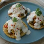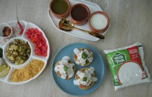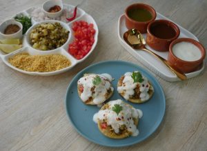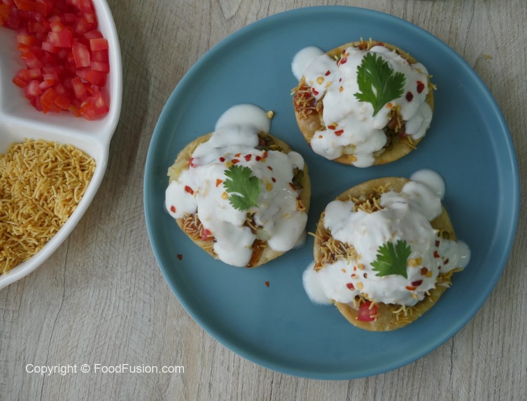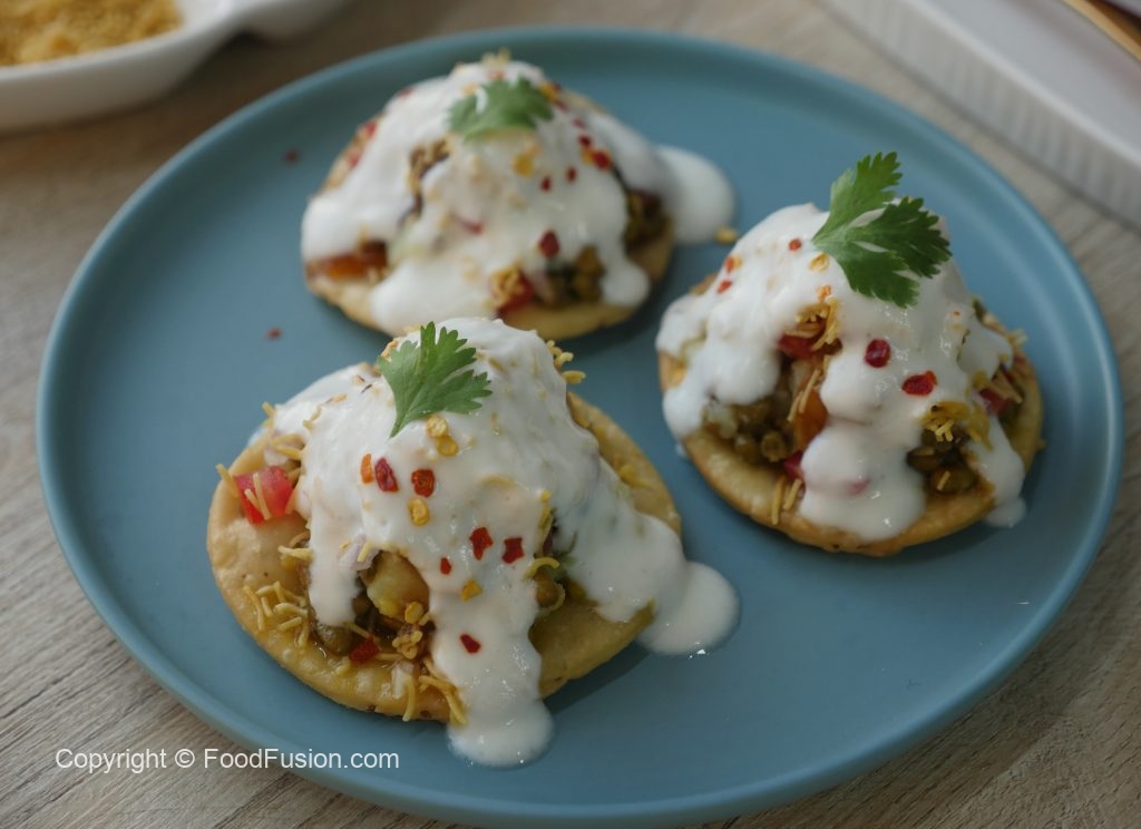 Puri per aloo+hari mong daal,pyaz,tamatar,chaat masala,lemon juice,hari chutney,imli chutney,sev nimco,dahi aur lal mirch crushed dal ker serve karein.