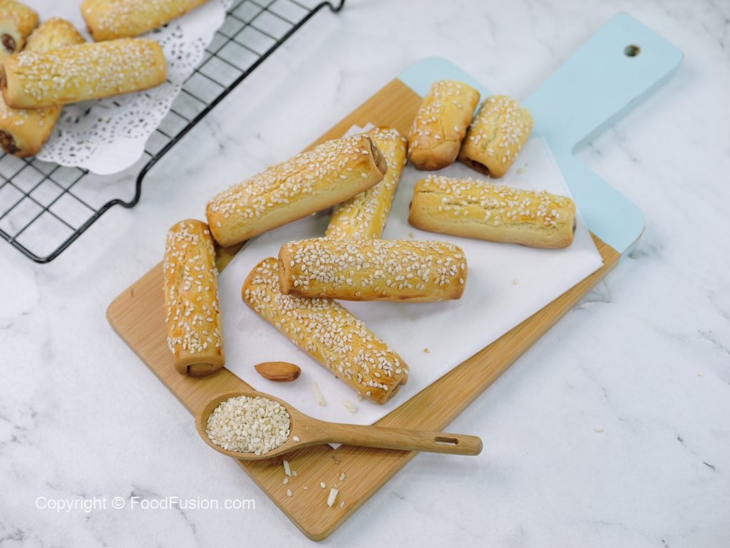 -Dough per rolled date filling rakh dein aur dough ko slightly roll ker lein aur edges ko seal ker ka 3” finger cookie mein cut ker lein.