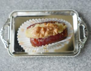 By using pipe in bag,fill dates with cream cheese+honey mixture and coat in crushed walnuts.