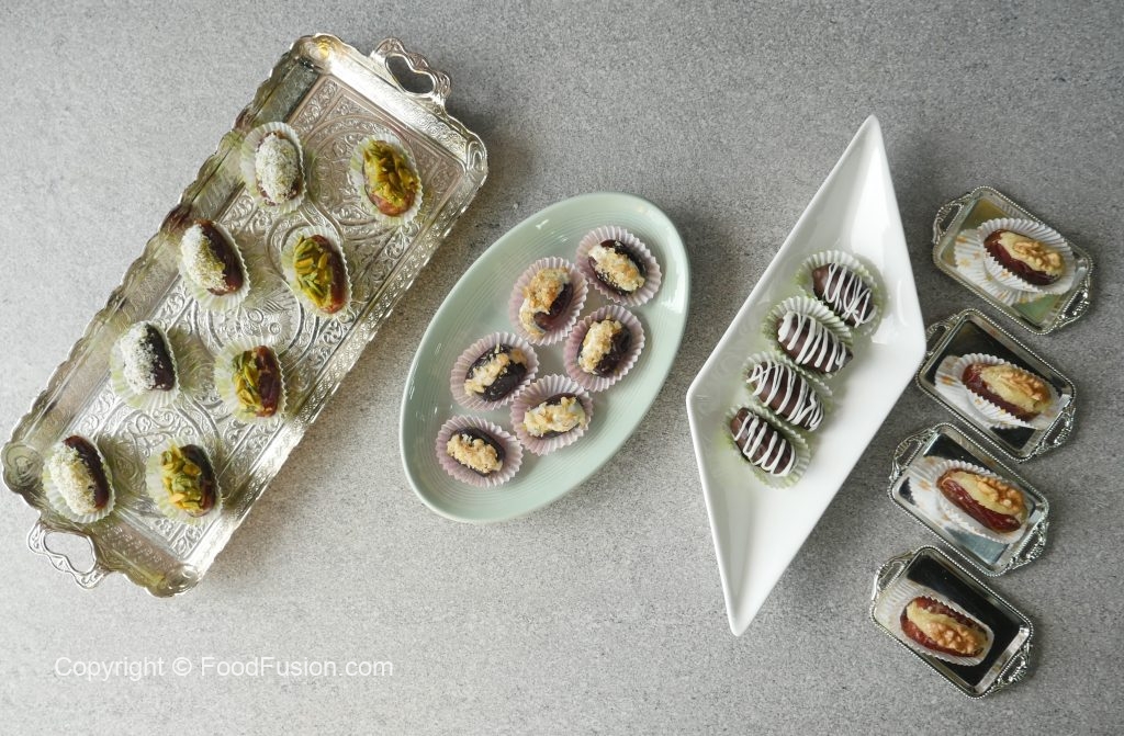 Khajure mein tayyar filling bhar dein aur pista ya khopra sa garnish ker ka serve karein.