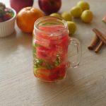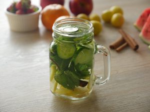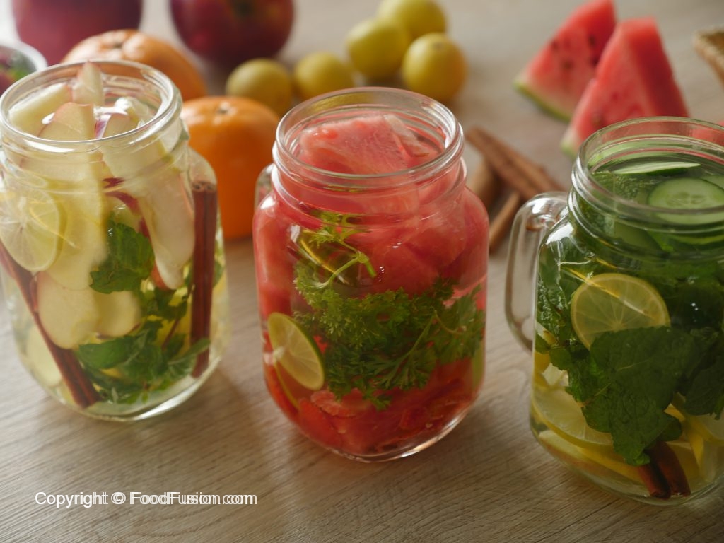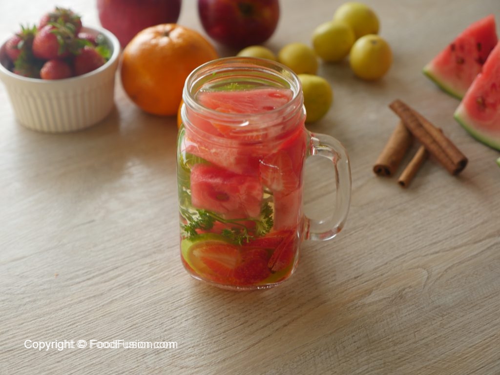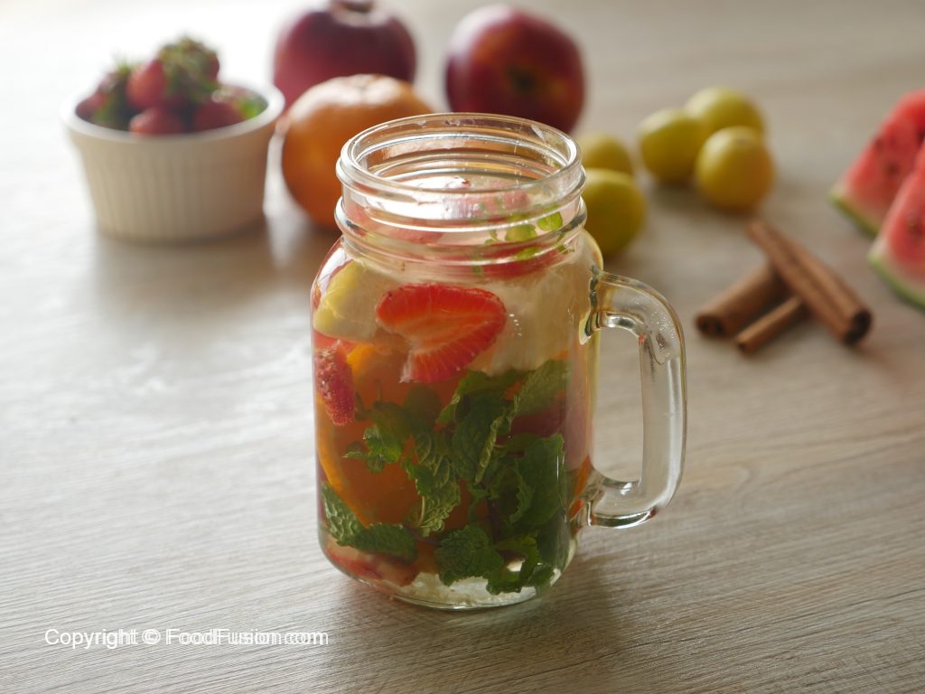 Jug mein strawberries,grape fruit,orange,kiwi,podina,apple cider vinegar aur thanda pani dal dein aur stir ker ka cover ker lein.