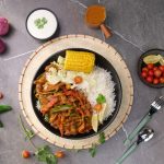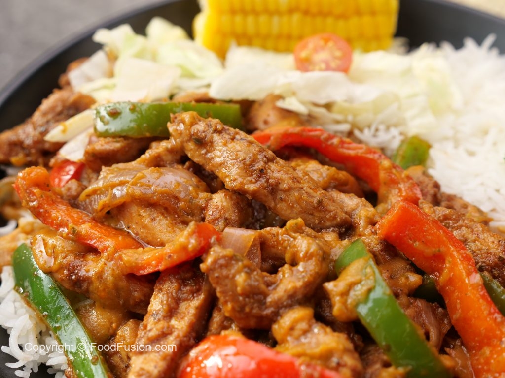 -Serving bowl mein boiled rice,tayyar fajita chicken,tayyar tomato sauce,iceberg,corn cob,lemon wedges & cherry tomato ka saath serve karein!