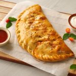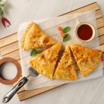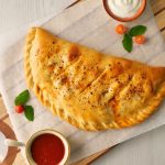 -On baking tray,place prepared calzone & with the help of the knife slightly add marks on the surface,apply egg wash & sprinkle red chilli crushed (makes 2).