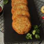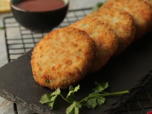 Grease hands with oil,take small quantity of mixture (approx. 50-55g) & make kababs of equal sizes then dip into whisked eggs & coat with breadcrumbs (makes 12-15).