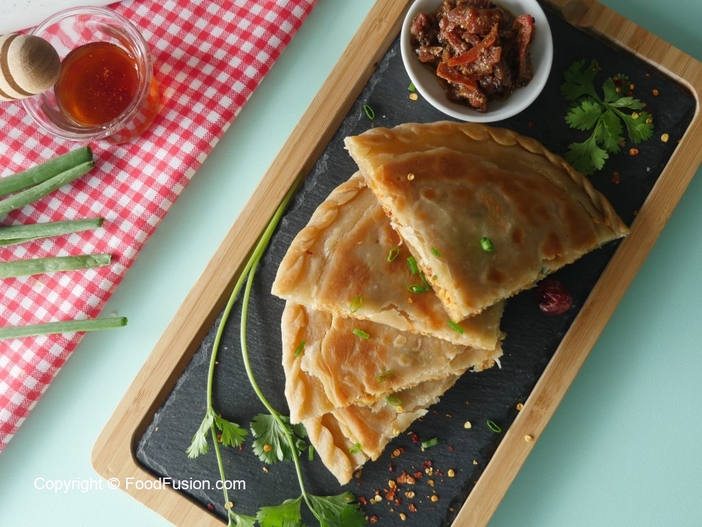 Roll out another dough with the help of rolling pin,add & spread prepared chicken filling,green onion leaves,mozzarella cheese,place another rolled dough,press & seal the edges (makes 6).