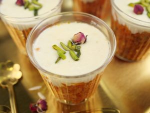 -In a serving glass,add prepared gajar halwa,creamy khoya & garnish with pistachios,dried rose & serve!