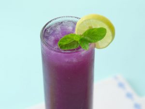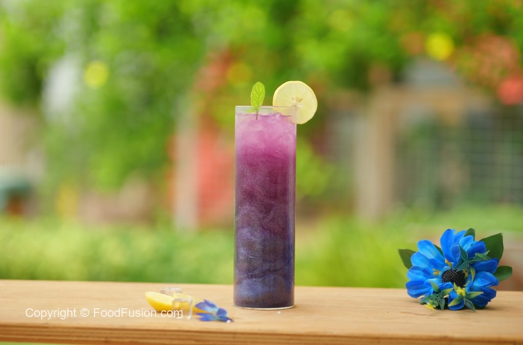 -In a glass,add crushed ice,prepared butterfly pea syrup (3/4 cup),edible silver glitter & mix well.