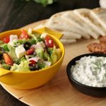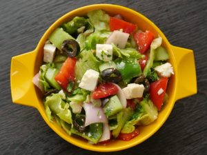 Bowl mein shimla mirch,kheera,tamatar,pyaz,ice berg,brown sugar,namak,kali mirch crushed,black olives,lemon juice,feta cheese aur olive oil dal ker mix ker lein.