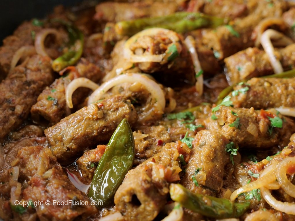 In a wok,add cooking oil,seekh kabab & fry on medium flame until golden brown (4-5 minutes) & set aside.