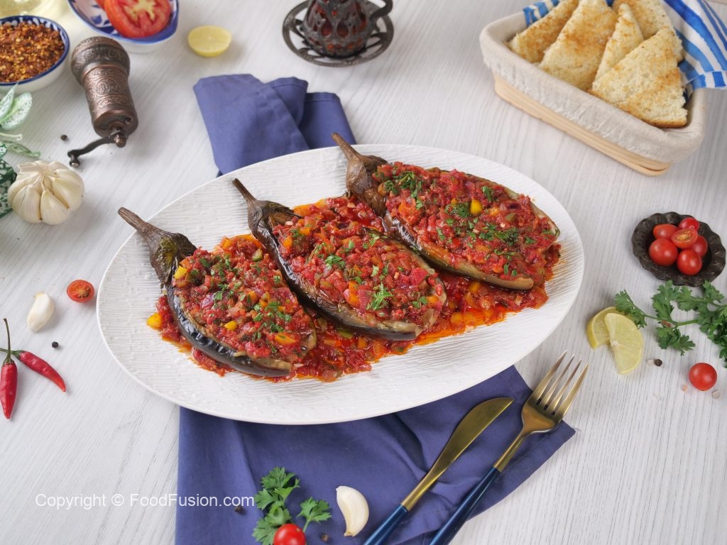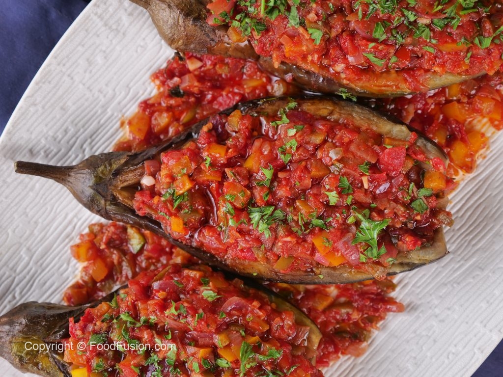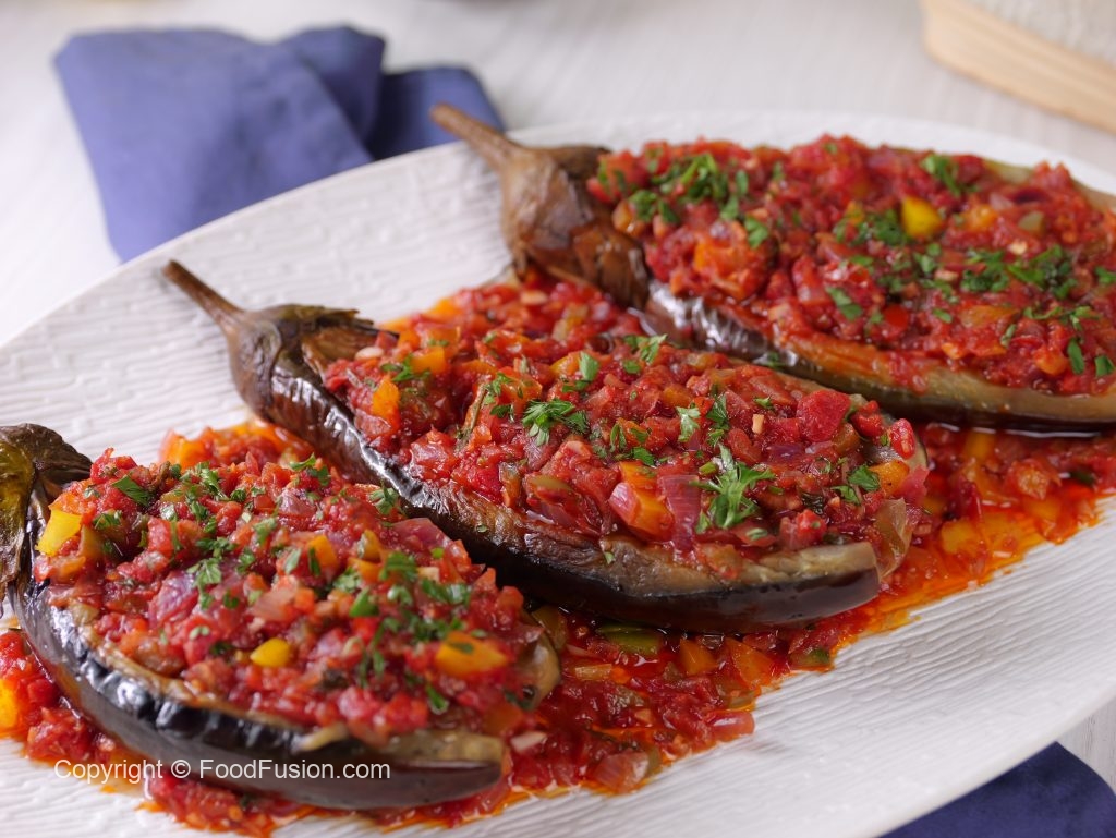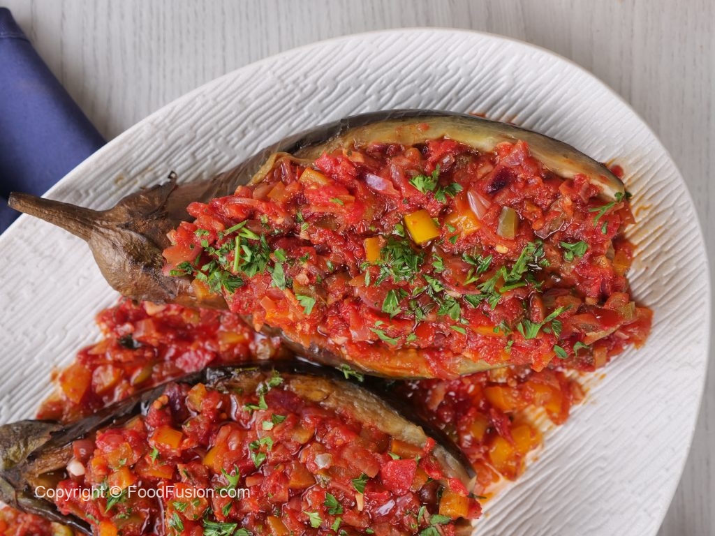 -Make a slit in each eggplant lengthwise with the help of knife & open with spoon.