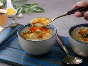 -In a saucepan add water, ½ Cup (approx. 100g) instant chicken corn soup mix & whisk well.