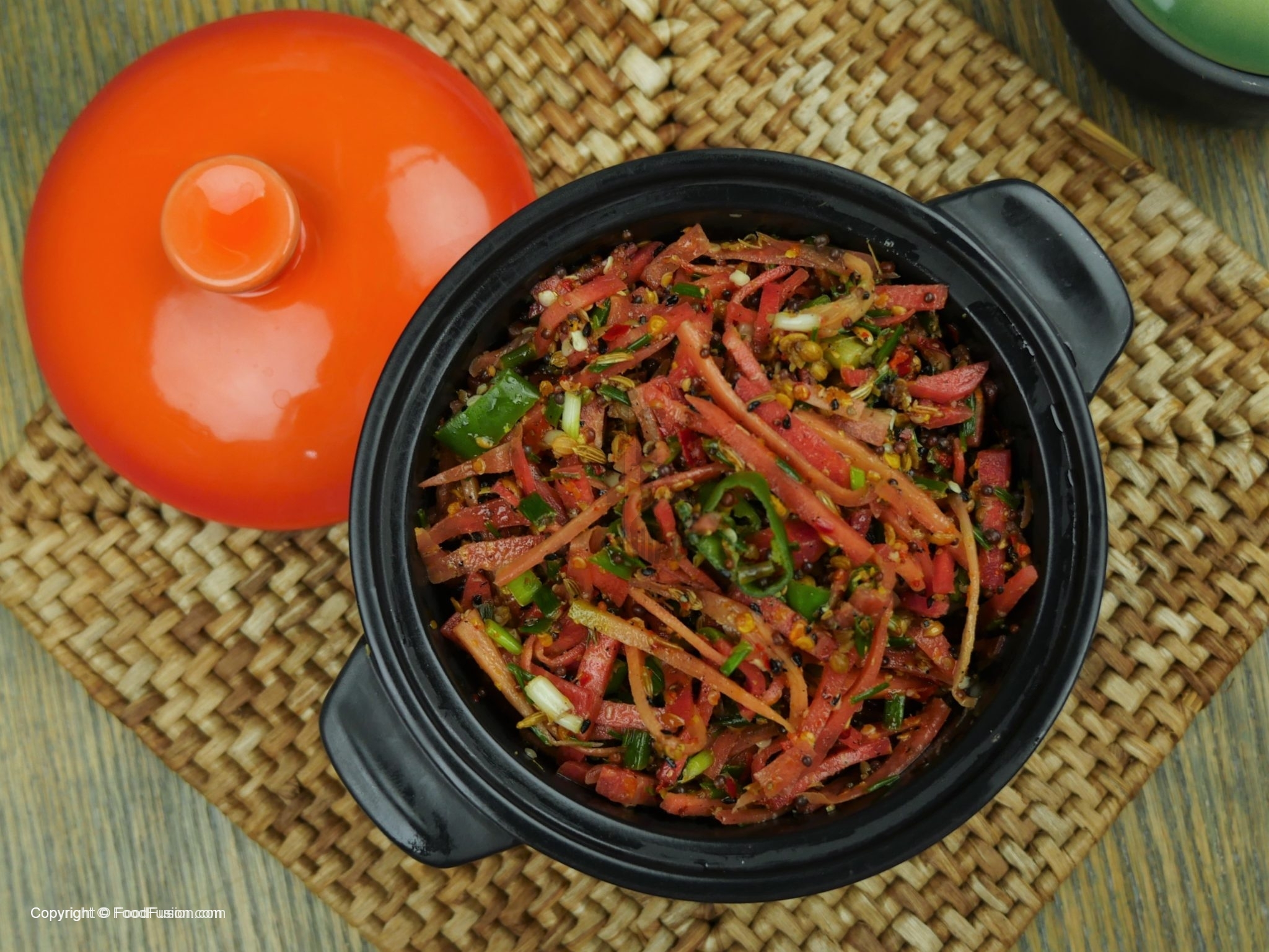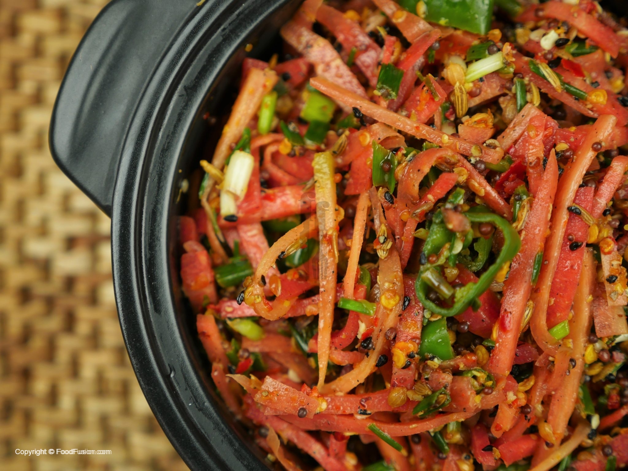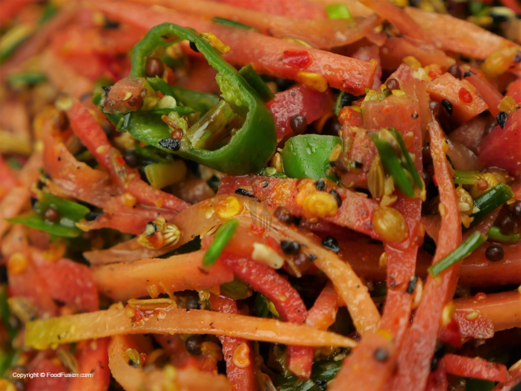 Bowl mein oil,kalonji (crushed),rai dana (crushed),dhania (crushed),namak,kuti lal mirch,saunf (crushed),tatri,lehsan paste,hara lehsan,hari mirch aur gajar dal ker ache tarhan mix ker lein.