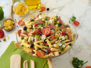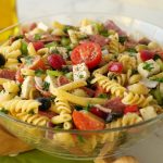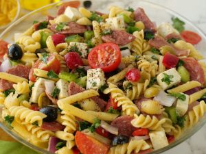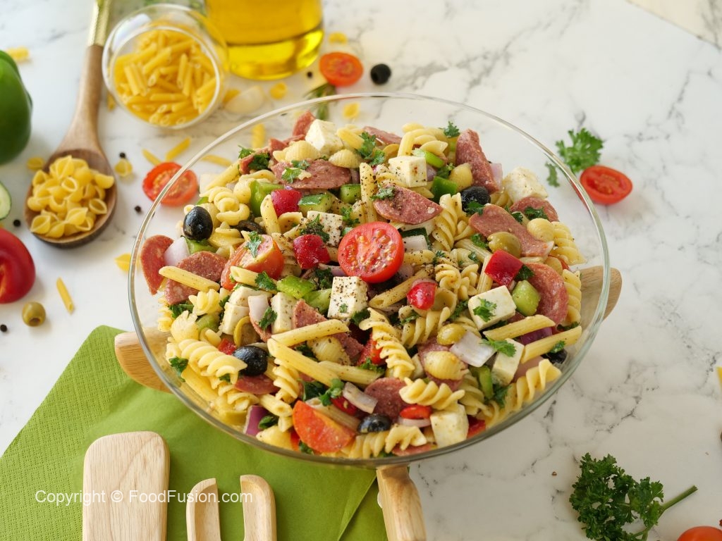 -Red bell pepper,kheera,black olives,green olives,cherry tomatoes,shimla mirch,beef pepperoni, pyaz,cottage cheese aur fresh parsley dal ker ache tarhan toss ker lein.