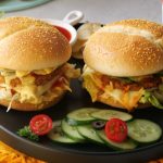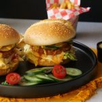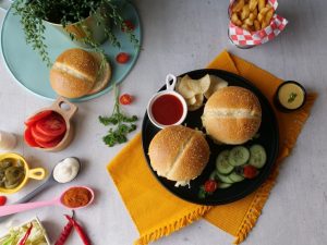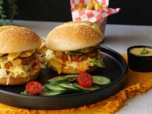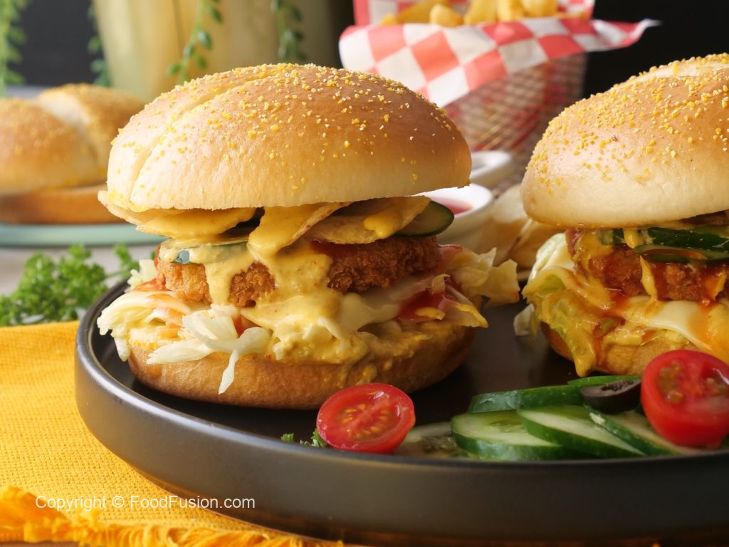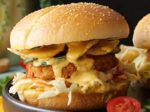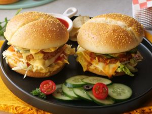 -Burger bun per tayyar jalapeno mayo sauce dal ker pheela lein,iceberg,cheese slice,fried veggie bureger patty,tomato ketchup,kheera,bakery chips aur tayyar jalapeno mayo sauce dal dein & burger bun sa cover ker lein (makes 4) & serve!